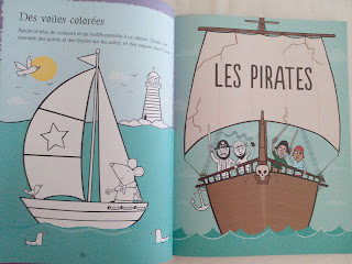 Mon grand livre d'activités et de coloriages...est topissime parce que ce cahier de jeux énorme et imposant propose des thèmes actuels que tous les enfants aiment, enfin surtout les garçons. Car Mon grand livre d'activités et de coloriages est tout de même concentré sur les pirates, les dinosaures, les châteaux et chevaliers, les monstres et le football. Deux thèmes plus mixtes que sont les vacances et fantômes et sorcières pourront réconcilier les goûts et les couleurs. Car après tout, pourquoi les petites filles n'aimeraient-elles pas le football, les dinosaures et les pirates ? Passer ce détail, c'est un cahier incroyablement dynamique et génial tellement il y a une foule de jeux à découvrir, d'énigmes à résoudre, d'exercices d'écriture et d'imagination. Chaque thème a ses jeux, pour les vacances il faudra par exemple construire un château de sable, remplir les passeports, colorier des poissons. Le thème des pirates est de loin mon préféré avec des jeux variés, attractifs, amusants. C'est l'occasion d'en apprendre sur cet univers (l'abordage, les règles, les drapeaux...). J'ai adoré la partie Dinosaures qui propose des pas à pas pour apprendre à les dessiner de manière réaliste et précise. Un livre vraiment sympa à emporter partout (dans les valises!) pour bien s'occuper!