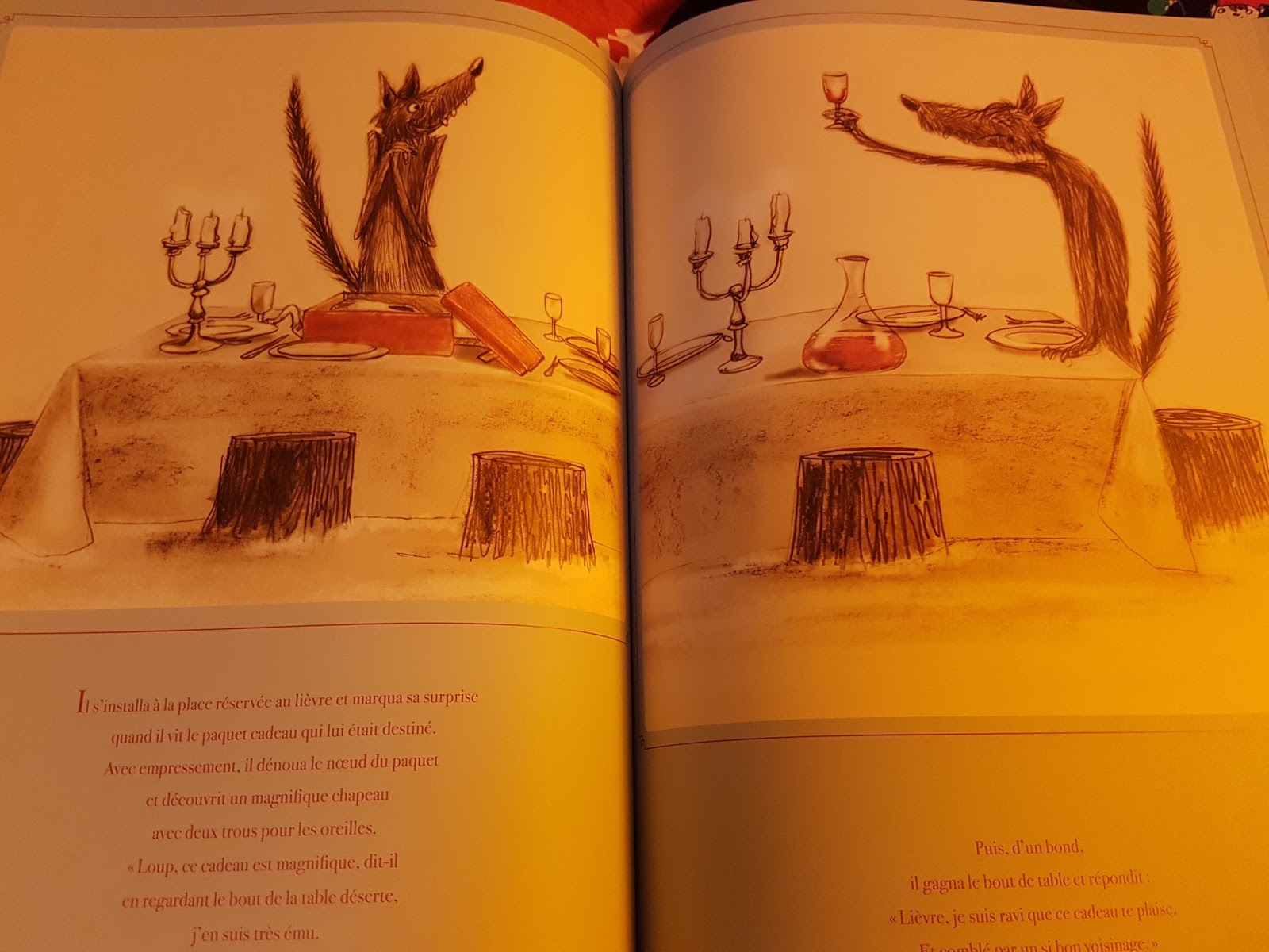 Encore une fois, l'auteur nous offre un texte poétique, digne des plus beaux contes de Noël... des contes qui prônent les valeurs de pardon et de rédemption. Mais la fin tristounette, même si elle annonce des Noëls meilleurs, reste extrêmement attachante. J'étais un peu triste pour ce loup qui souffre d'une dure réputation. Il aura droit à un modeste merci, les invités finalement seront remplis de regrets. Le chemin est long vers un total pardon mais le loup y croit.