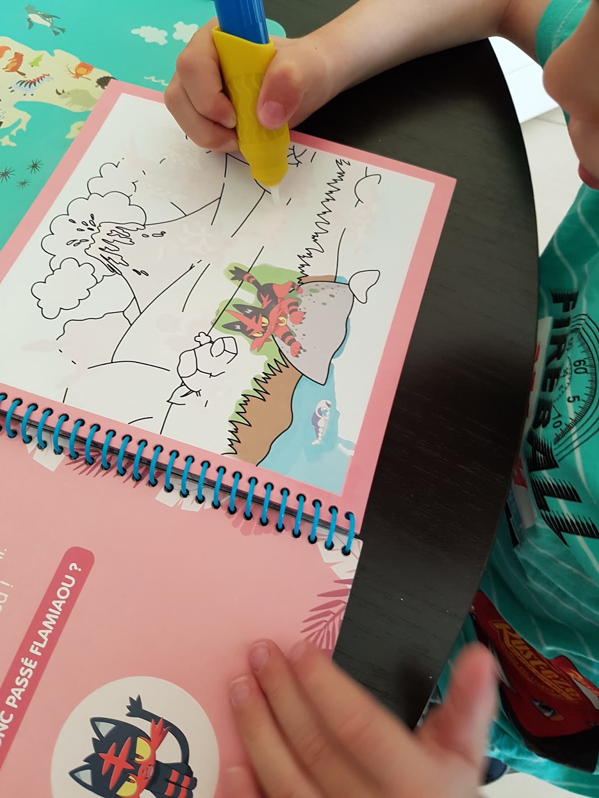 Je crois que ses coups de coeur vont au Cherche et trouve à créer car il y a un poster géant et plus de 100 autocollants à coller pour décorer et mettre en scène le paysage. Il a terminé le poster en 1h max et il a adoré reconnaître tous les Pokemon qu'il connaissait.